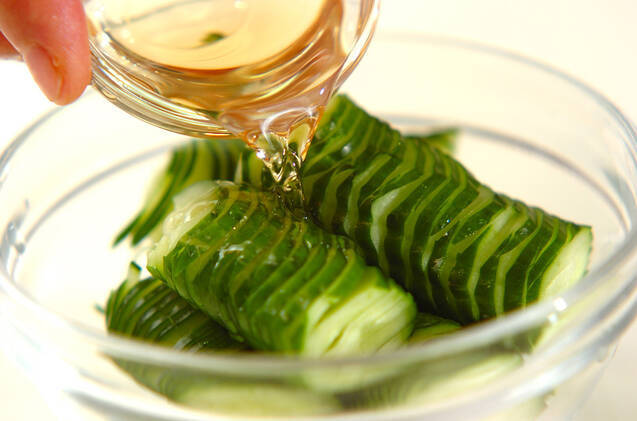 キュウリはしんなりしたら水気をきり、作り置き甘酢を全体にかける。