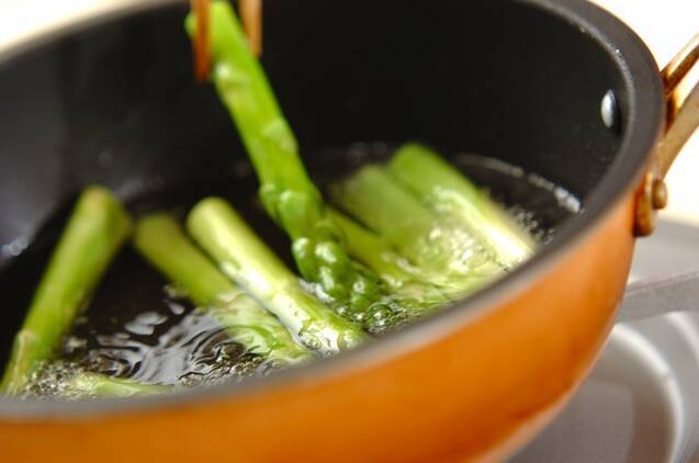 フライパンに1cmくらいの揚げ油を170℃に予熱し、グリーンアスパラを素揚げして油をきる。塩コショウを振り、器に盛る。