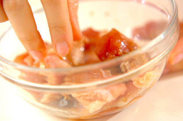 <鶏肉の磯辺竜田揚げ>を作る。鶏もも肉はひとくち大に切り、合わせた<下味>の材料にからめ、時々返しながら15分おく。揚げ油を160℃に予熱し始める。