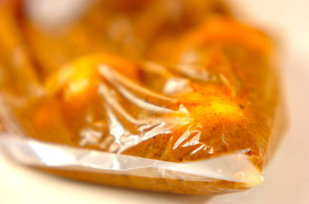 <カレー卵>を作る。抗菌の袋にカレー粉とだし汁、塩コショウを入れて混ぜ合わせ、ウズラの卵を漬けて半日以上置いておく。詰める直前に水でサッと洗い、余分なカレー粉を落とす。