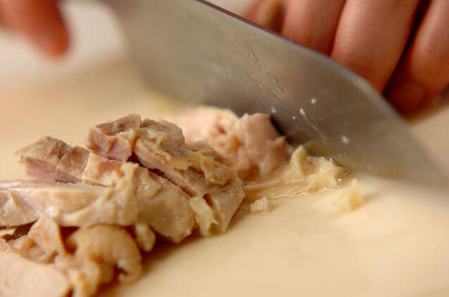 鶏もも肉の身の厚い部分に竹串を刺し、透明な煮汁が出たら取り出し、そのまま常温まで冷まし、食べやすい大きさに切る。