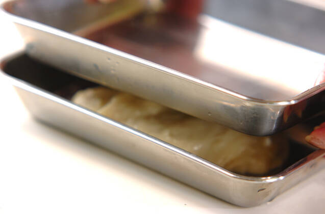大きめのバットに氷水を入れ、それより小さめのバットを2枚用意する。1枚の小さめバットの内側を水でぬらして1を流し入れる。もう1枚の小さめバットの底をぬらして重ね、押さえてペタンコにし、氷水を入れたバットにつけて冷やす。