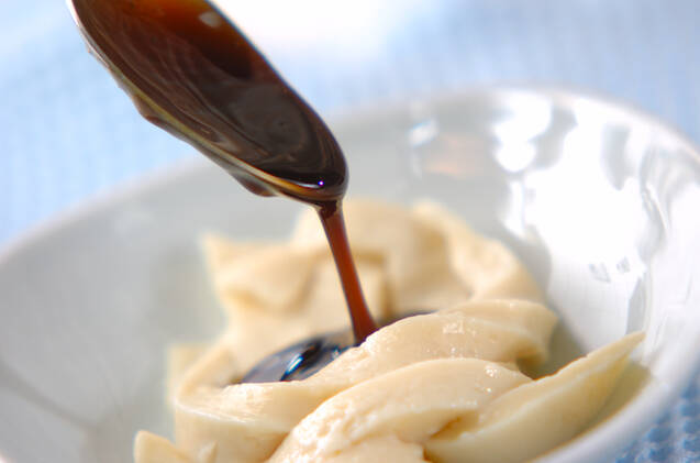 しっかり冷たくなったら取り出し、食べやすい大きさに切り、氷水にサッと通して器に盛る。<黒みつソース>を掛け、きな粉を振り掛けて、あったらミントの葉を添える。