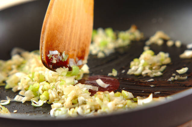 フライパンにゴマ油を弱火で熱し、白ネギとショウガを香りがたつまで炒める。
