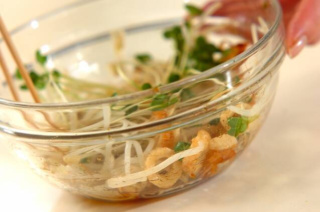 (1)にモヤシ、ちくわ、貝われ菜を加え、和える。器に盛る。