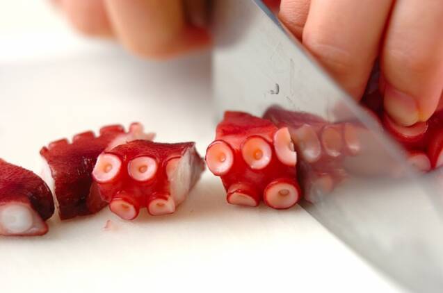 お米は炊く30分前に水洗いし、ザルに上げておく。ゆでタコ足は水洗いして水気を拭き取り、小さめのひとくち大に切って塩をもみ込む。