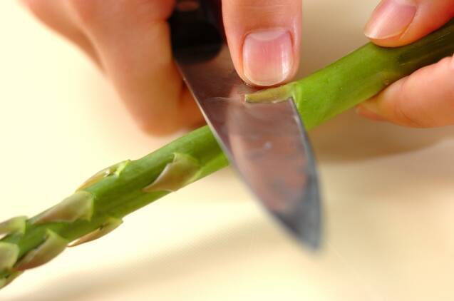 グリーンアスパラは根元を切り落とし、ピーラー等で根元の皮とハカマを取り除き、幅1cmに切る。