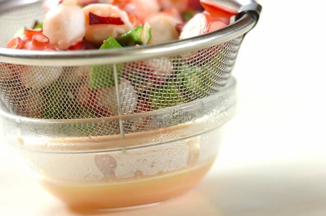 白ワインを加え、煮たったらザルに上げて具と汁に分ける。具は乾燥を防ぐためにラップをかける。