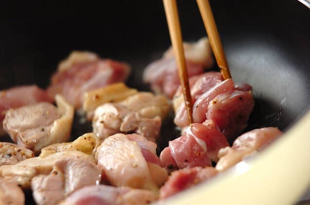 フライパンにオリーブ油小さじ2を入れて弱火にかけ、鶏肉に焼き色がつかないようにゆっくり5~6分焼く。フライパンの蓋をして蒸し焼きにしてもOKです。