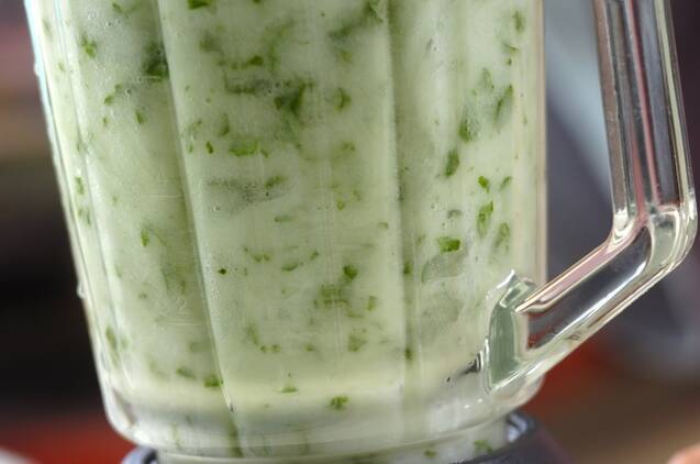 ミキサーにバジルの葉、(2)、レモン汁を入れ、かくはんする。バットに流し入れてラップをし、冷凍庫で約1時間冷やしかためる。