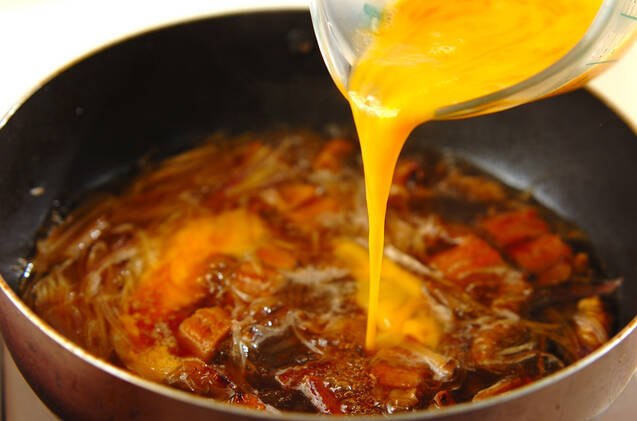 溶き卵をまわし入れ、鍋、またはフライパンに蓋をし、半熟になったら火を止める。