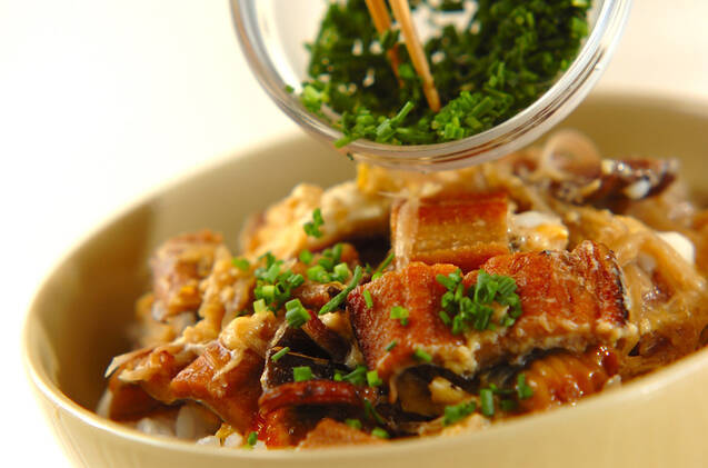 丼にご飯をよそって(2)をのせ、アサツキを散らす。