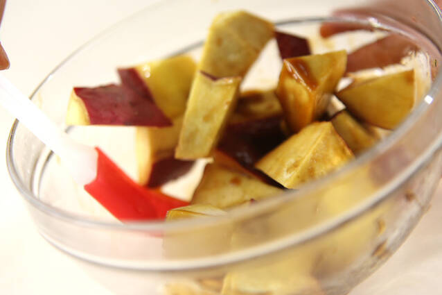 サツマイモに黒みつをからめ、器に盛り、きな粉をかける。