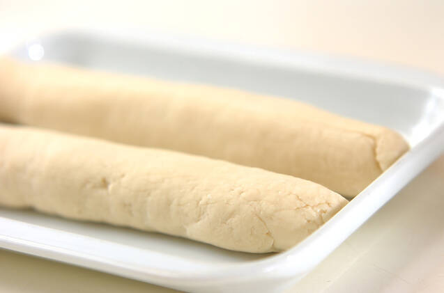 <餃子の皮>の生地を作る。1 粉類と塩を合わせてボウルに振るい入れ、ぬるま湯を入れながらひとまとまりになるまでこねる。2 半分に分け、太さ3cm、長さ20cmくらいの棒状に成形し、ビニール袋に入れて20分以上寝かせる。
