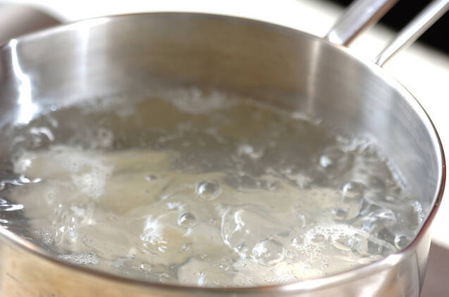 長芋は皮をむいて1cm角の棒状に切り、熱湯でサッとゆでてザルに上げ、しっかり水気をきる。