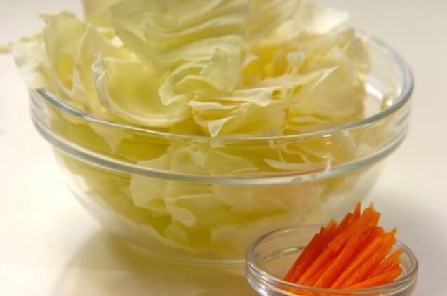 キャベツは芯のかたい部分を削ぎ落として、ひとくち大に切る。ニンジンは皮をむいて、せん切りにする。