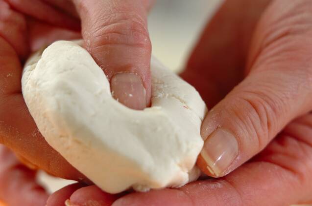 ボウルに白玉粉を入れ、分量外の水を少しずつ加えながら、耳たぶ位の柔らかさに練る。イチゴはヘタを取り、縦4つに切る。