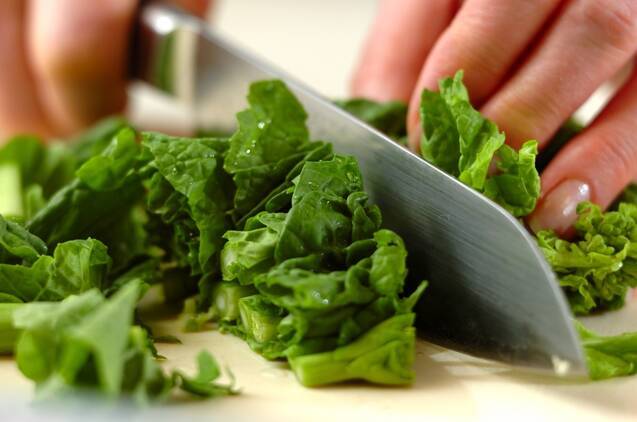 菜の花は水洗いし、根元のかたい部分を少し切り落とし、長さ2cmくらいに切る。 ベーコンは幅1cmに切る。