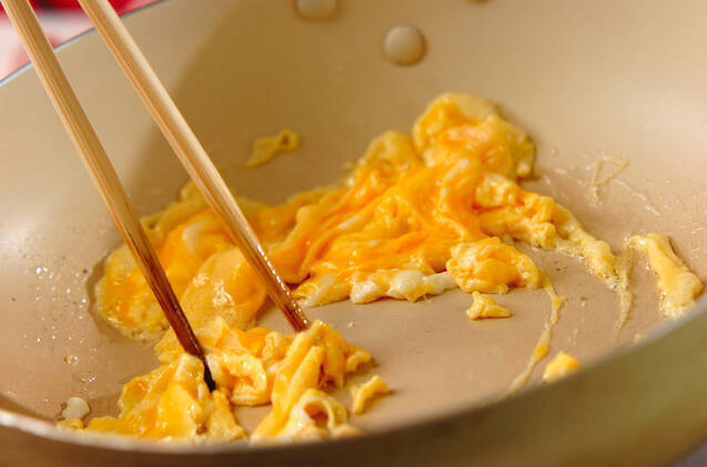溶き卵に塩少々を混ぜ、サラダ油大さじ1を熱したフライパンに流し入れて半熟に火を通し、いったん取り出す。