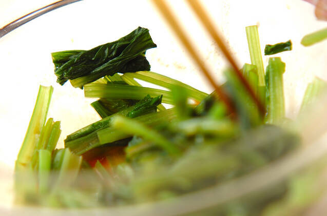小松菜は根元を少し切り落とし、長さ3~4cmに切って<カラシダレ>に加えて和え、器に盛り分ける。(ヒント)ゆでた小松菜の根元に砂がある場合は、水洗いして水気を絞る。