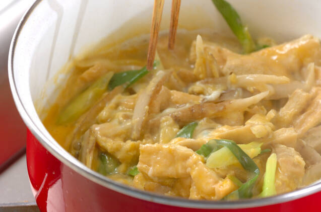 再び煮立ったら、合わせ卵を加えて半熟状に固まってきたら火を止め、器に盛り分けてお好みで七味唐辛子を振り掛ける。