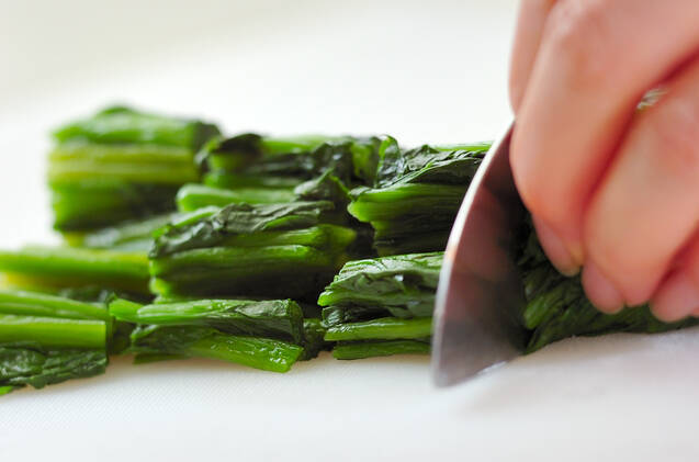 鮭は塩コショウをして置いておく。ホウレン草は水洗いしてラップで包み、電子レンジで2分加熱し、しんなりしたら水に取って粗熱を取り、水気を絞る。根元を少し切り落とし、長さ3cmに切る。電子レンジは600Wを使用しています。