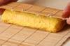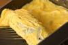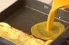 卵焼き器を中火にかけ、サラダ油を薄くひき、卵液1/3量を流し入れて全体に広げる。