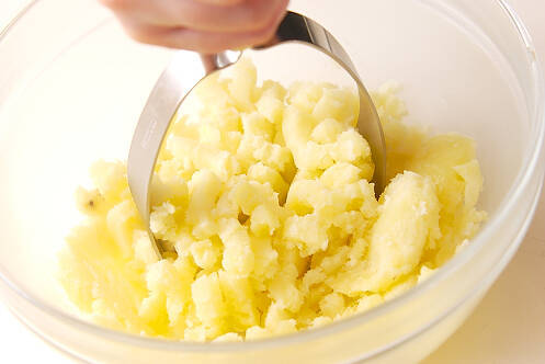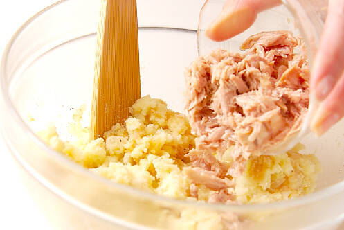 ジャガイモが熱い間にタオルなどで包みながら皮をむき、マッシャーでつぶし、玉ネギ、生クリーム、白ワイン、しょうゆ、塩コショウを加えて混ぜ合わせ、ツナ缶を汁ごとを加え、混ぜ合わせる。