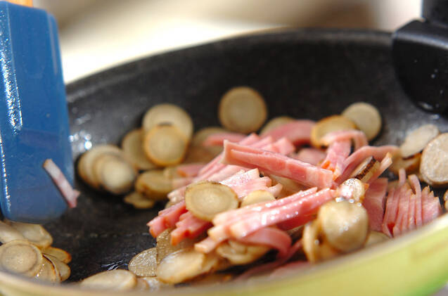 フライパンにサラダ油を熱し、ゴボウを炒める。しんなりしたらベーコンを加えて炒め合わせ、脂が出たら<調味料>を加え、煮汁が少なくなるまで炒め合わせる。