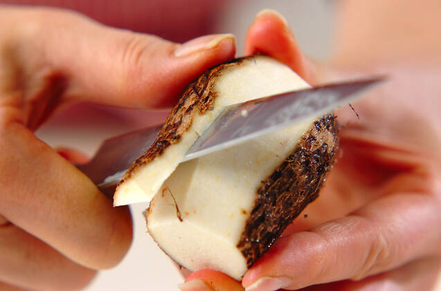 赤目芋は上下を切り落として皮をむき、水洗いする。