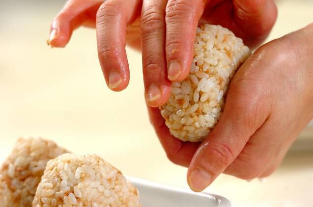 ご飯に(1)、白ゴマを加えて混ぜ合わせ、お好みの形ににぎる。おにぎりの数に分けた焼きのりを巻き、器に盛ってお漬け物を添える。