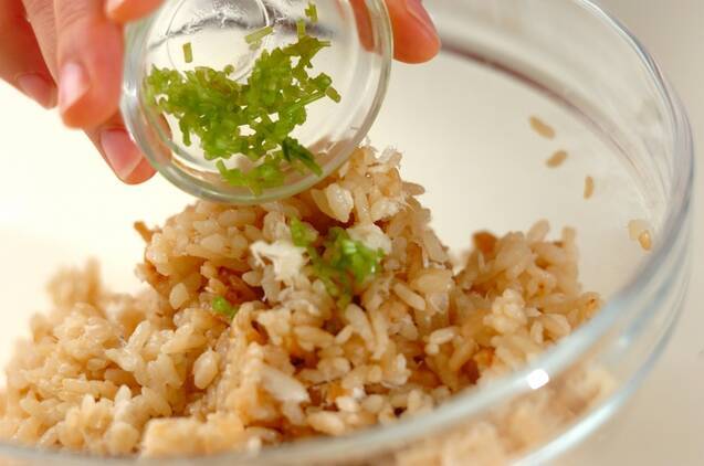 ボウルに茶碗2杯分の鯛めしをよそい、刻んだミツバの茎を加えて切り混ぜる。