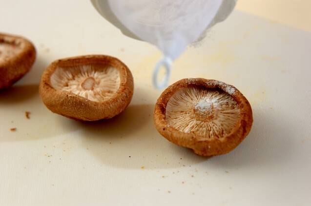 シイタケは軸を切り落として汚れを拭き取り、笠の内側に塩コショウを振り、さらに薄く片栗粉をからめる。