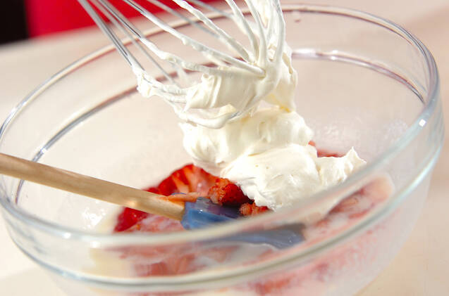 イチゴを加えて混ぜ、さらに生クリームの半量を加えて泡立て器で混ぜ合わせる。全体に混ざったら、残りの生クリームも加えて混ぜ合わせる。