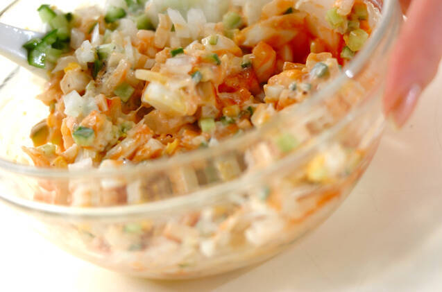 <ソース>を作る。ゆで卵は細かく刻み、新玉ネギ、キュウリはみじん切りにし、全ての材料を混ぜ合わせる。