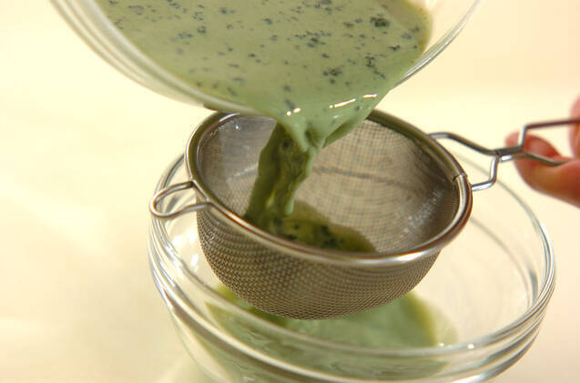 ボウルに抹茶、牛乳を入れて、電子レンジで温まる程度に加熱する。茶せんや泡立て器でよく混ぜ合わせ、ダマが残らないように網を通す。