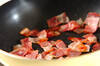 フライパンを熱し、ベーコンを入れて弱火でじっくりカリカリになるまで焼く。