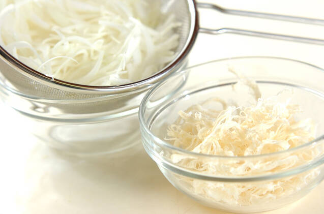 玉ネギは縦薄切りにし、水に放ってザルに上げる。