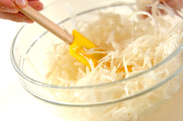 <ドレッシング>のボウルに玉ネギとサキイカを入れて混ぜ合わせ、器に盛ってかつお節を振る。