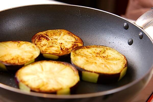 加茂ナスは上下を少し切り落とし、縦縞に皮をむき4つの輪切りにする。塩水に放ち、5分置き水気を拭き取る。フライパンにサラダ油大5を強めの中火で熱し、ナスの両面に焼き色が付くまで焼く。