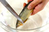 アユは包丁の先で軽くしごくようにウロコとヌメリをこそげる。腹に切り込みを入れ、腹ワタを出す。身はサッと水洗いをして水気をよく拭き取り、塩コショウを振る。