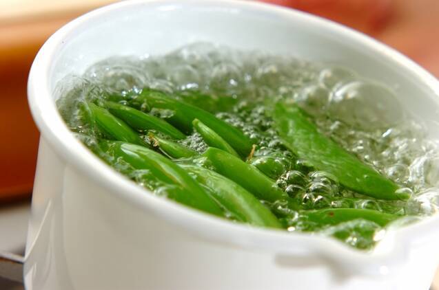 レタスは洗って水気をきっておく。湯を沸かして、筋を取ったスナップエンドウをゆで、冷たい水にとる。