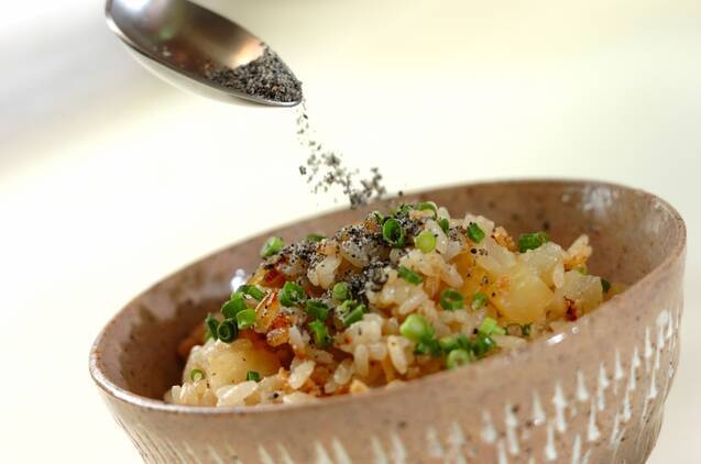 炊き上がったら、かたまっている鶏ひき肉をほぐしながら、サックリと全体を混ぜ、器に盛る。万能ネギとすり黒ゴマをかける。