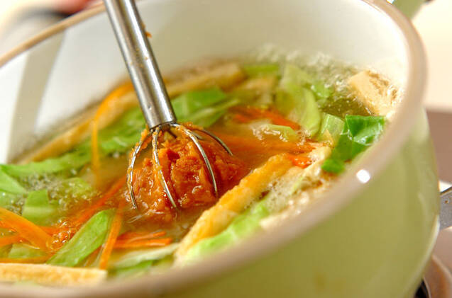 鍋にだし汁を中火で熱し、煮たったらキャベツ、ニンジン、油揚げを加える。キャベツがしんなりしたら、みそを溶き入れて火を止める。