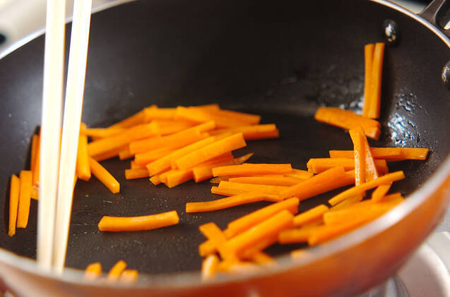 フライパンにゴマ油を熱し、ニンジンを入れて炒め、分量外の塩少々を加えてニンジンがしんなりするまで炒める。