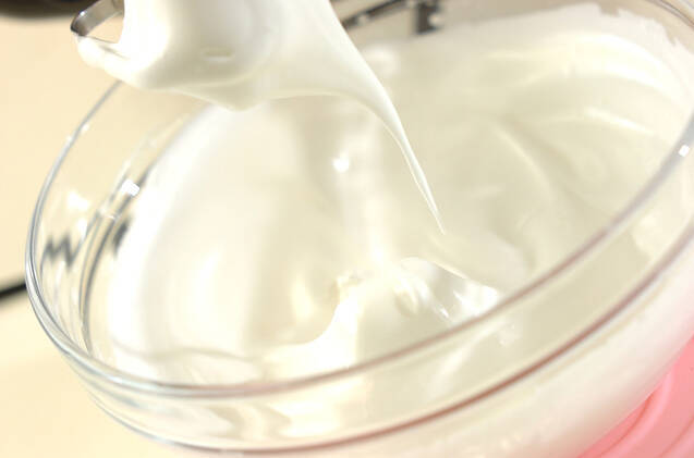 <チョコレート生地>を作る。ボウルに卵白を入れて泡立て、少しふんわりしてきたらグラニュー糖90gを2~3回に分けて加え、しっかりツノが立つまで泡立てる。