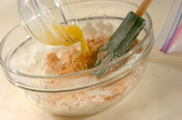 ボウルに(1)を入れて手で混ぜる。<粉類>の材料を振るいながら入れてサックリ混ぜ、三温糖、溶かしたバターを入れて混ぜる。