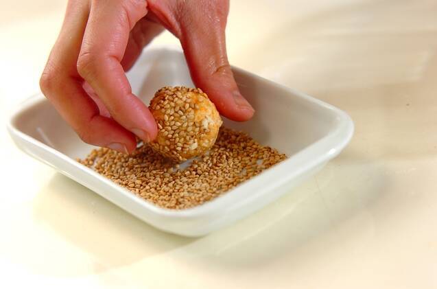 (2)をひとくち大に丸め、白ゴマを付ける。170℃に熱した揚げ油に入れて色よく揚げて油をきり、器に盛る。
