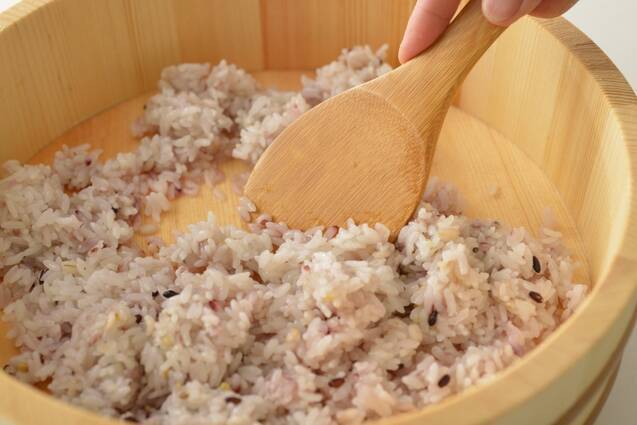 雑穀ご飯を飯台(ボウル可)に移し、作り置き甘酢を全体にまわしかけて切るように混ぜ合わせ、すし飯を広げてうちわなどで冷ます。