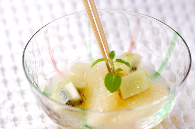 グレープフルーツ、キウイにホワイトキュラソーを掛けて冷やしておく。出来たら冷やした器に盛り、あったらミントの葉を添える。